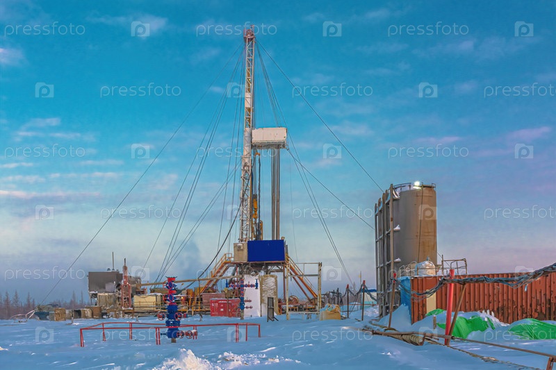 Бурение скважин зимой на нефтегазовом месторождении в Арктике. Полярный день с текстурированным красивым небом. Паровые затяжки для отопительного оборудования