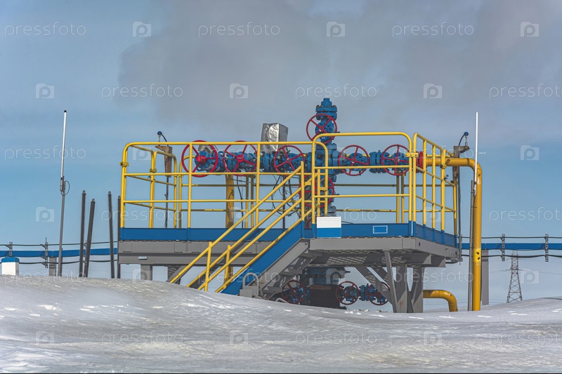 Скважины, добывающие природный газ на месторождении в Арктике. Фонтанное оборудование и технологическая обвязка группы скважин для добычи газа. Зима. День. Инфраструктура газодобывающего предприятия