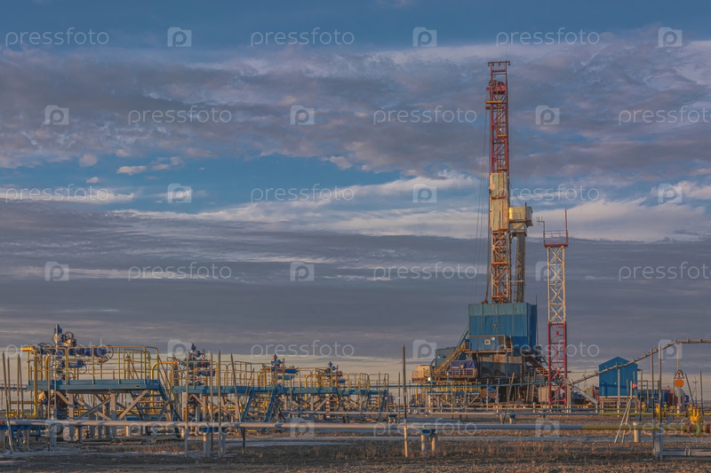 Скважины, добывающие природный газ на месторождении в Арктике. Фонтанное оборудование и технологическая обвязка группы скважин для добычи газа. На заднем плане буровая установка. Красивое небо
