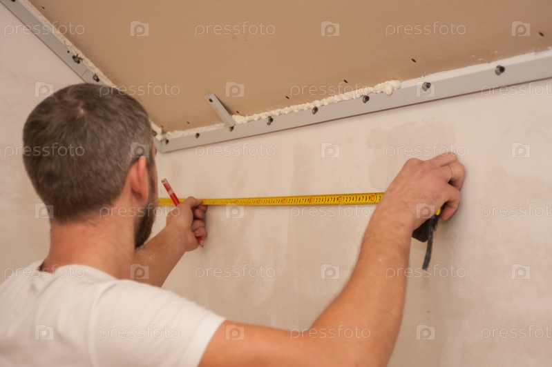 30-летний парень клеит обои на стену
