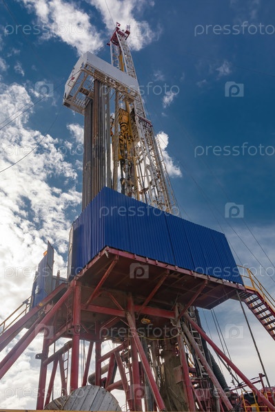 Буровая установка для бурения скважин на нефть и газ. Общий детальный вид. Вид сбоку снизу вверх. На фоне прекрасного неба. Буровая вышка на основании и бурильные трубы для спуска в скважину