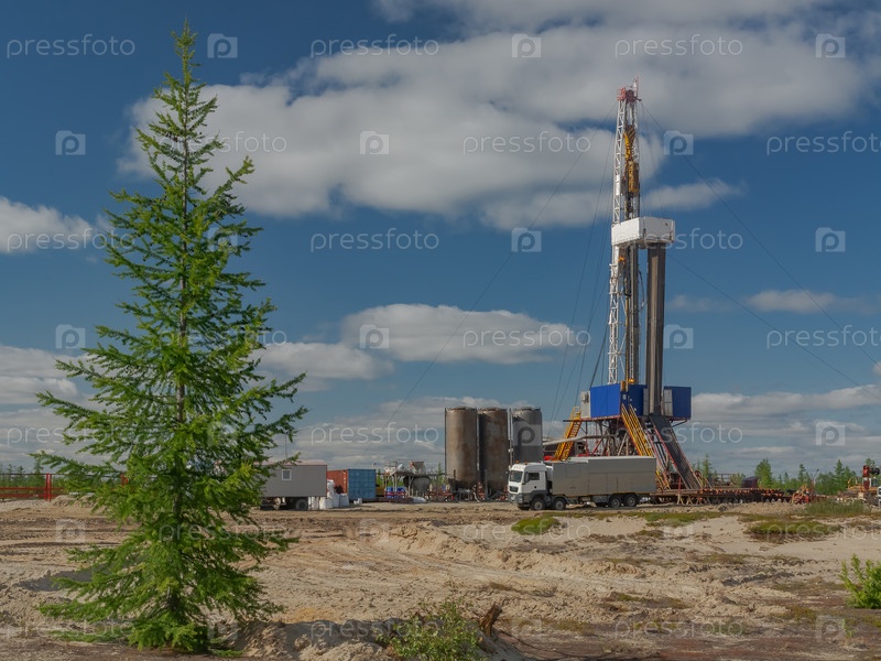 Пейзаж с буровой установкой на месторождении нефти и газа. Видна инфраструктура, средства связи и буровое оборудование. Вокруг буровой установки летняя северная тайга с зелеными деревьями и голубым небом