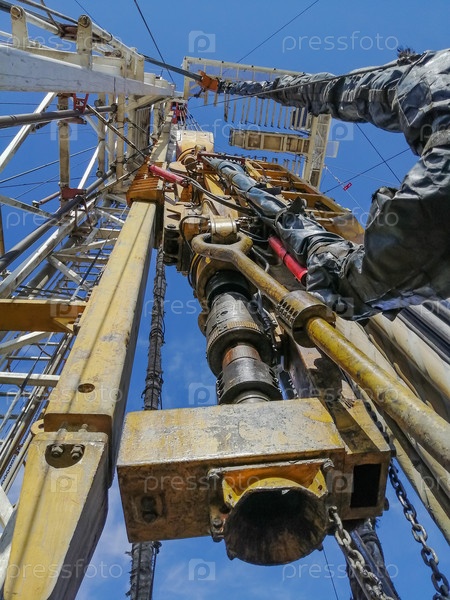 Вид на буровую установку изнутри вверх. Стальные бурильные трубы стоят. Верхний силовой привод перемещается по вышке на передвижной системе