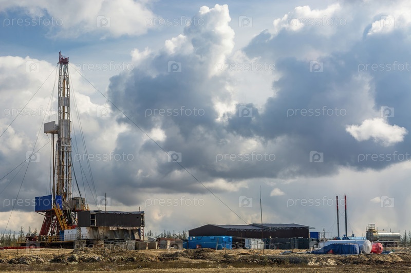 Природный ландшафт северного нефтегазового месторождения с буровой установкой для бурения глубоких скважин. Весенний хвойный лес, голубое облачное небо