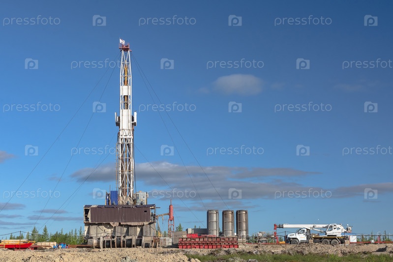 Буровая установка включена в ландшафт нефтегазового месторождения. Видна инфраструктура, средства связи и буровое оборудование. Буровая установка оснащена оборудованием для цементирования скважин
