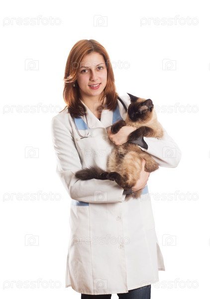 Девушка в медицинской форме с сиамской кошкой