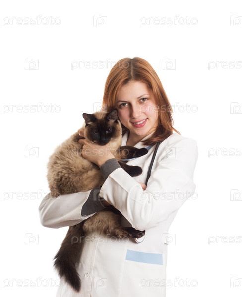 Девушка в медицинской форме с сиамской кошкой