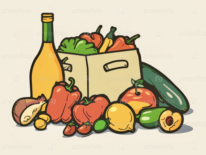 На бежевом фоне продукты для здорового питания: красный перец, зелень, кабачки, авокадо, лимон, яблоко, иллюстрация плоского графического дизайна