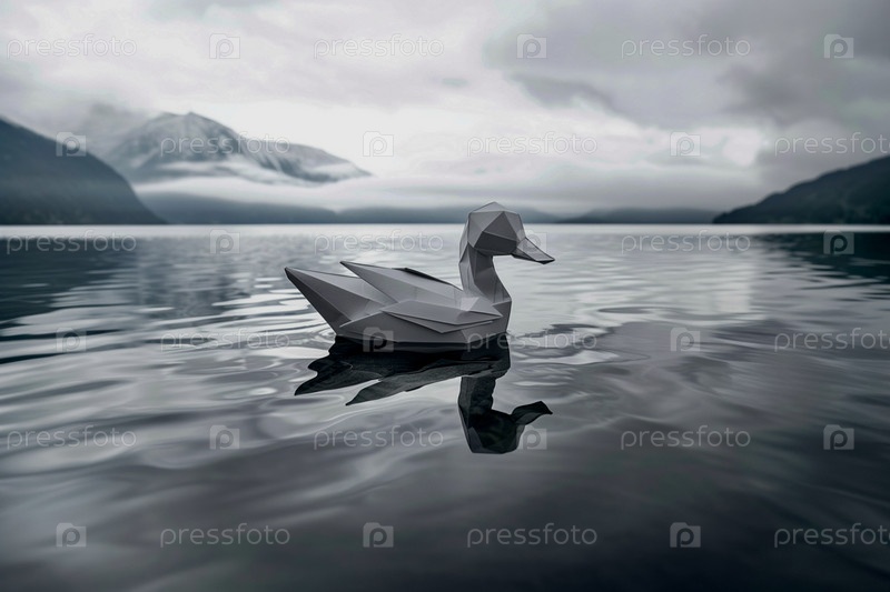 Одна утка из бумаги, монохрома и минимализма плывет по большому озеру
