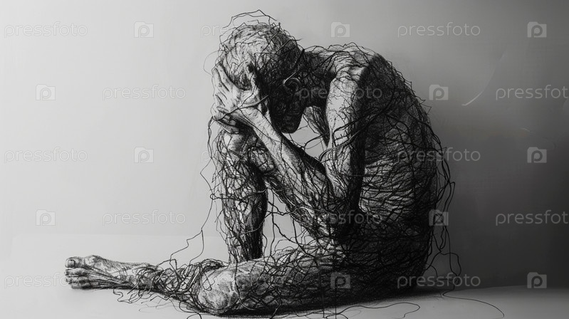 Несчастный человек, запутавшийся в психологических заболеваниях, концепции одиночества и депрессии