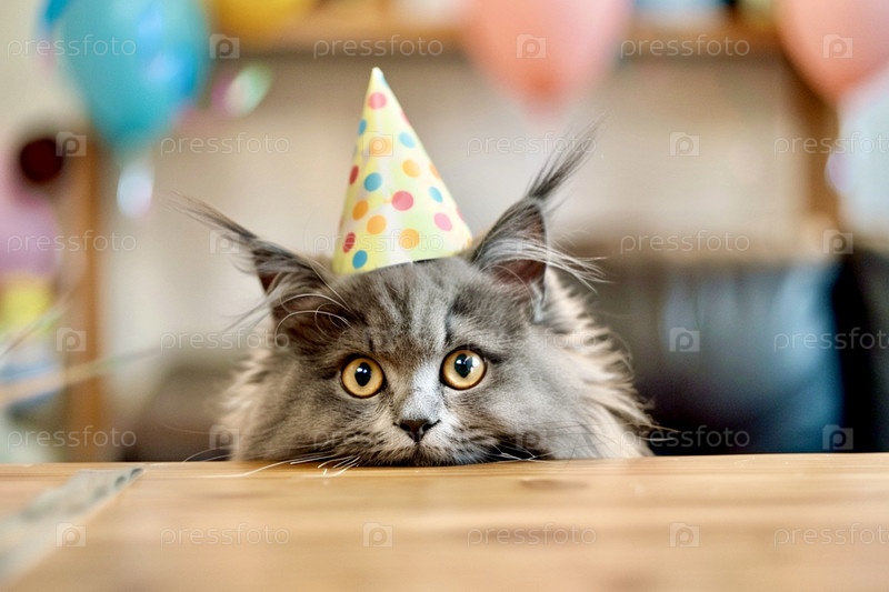 Серый кот в шляпе выглядывает из-за стола, день рождения кота