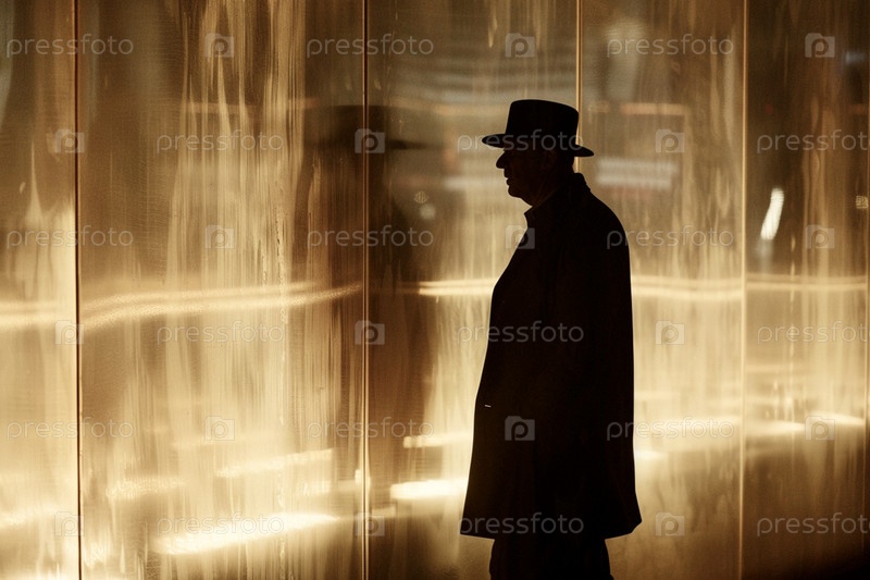 Силуэт пожилого мужчины в пальто и шляпе, стоящего вечером у стеклянной стены в одиночестве