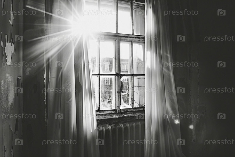 Луч солнечного света светит через старые деревянные грязные окна в пустую квартиру в монохромном стиле
