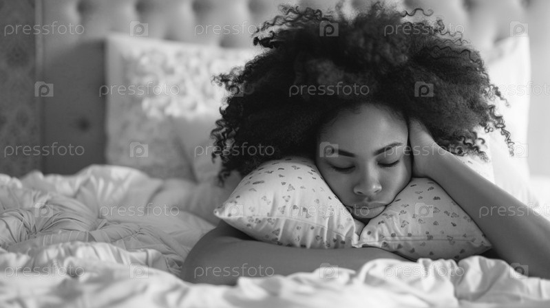В монохромном стиле африканская американка лежит на кровати, спрятав голову в подушку, она устала, у нее проблемы