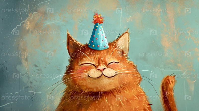 Иллюстрация счастливого рыжего кота с праздничной шляпой на голове
