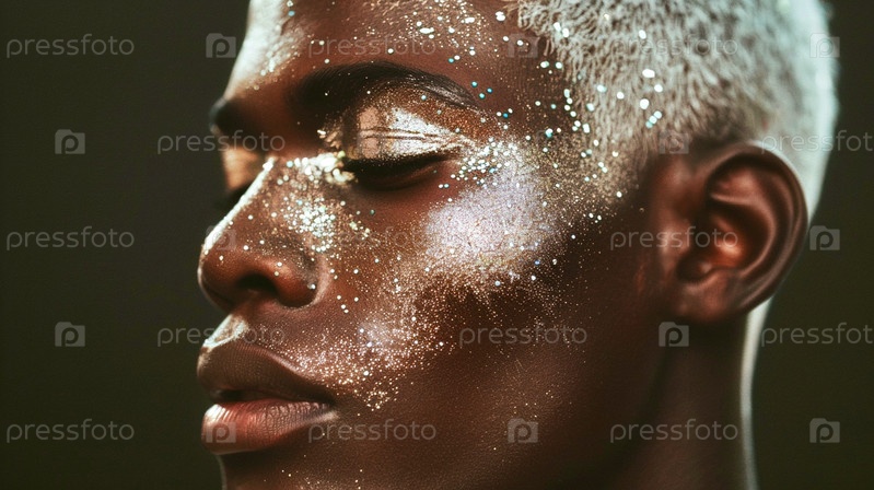 Афроамериканец с белой короткой стрижкой, креативным макияжем с блестками