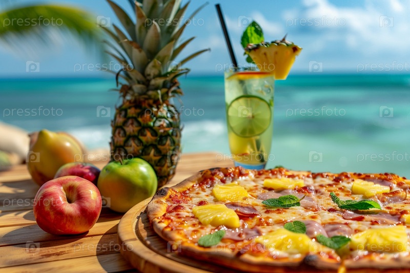 Гавайская пицца с ананасом и ветчиной и коктейль с тропическими фруктами в летнем кафе на фоне океана