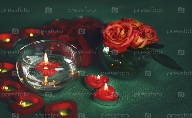 Букет роз, свечи и подарки, открытка на 14 февраля, День святого Валентина, 8 марта, Международный женский день, свадьба, день рождения, день матери, размытый фон, боке