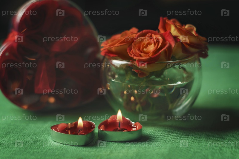 Букет роз, свечи и подарки, открытка на 14 февраля, День святого Валентина, 8 марта, Международный женский день, свадьба, день рождения, день матери, размытый фон, боке