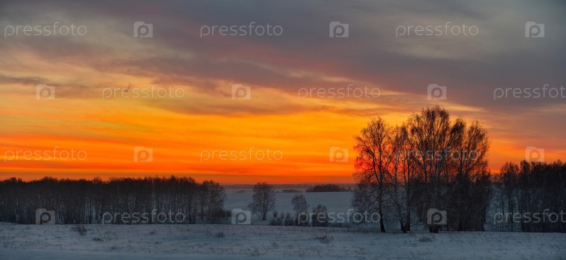 Россия, Южный Кузбасс. Разноцветный живописный рассвет морозным утром в заснеженных полях