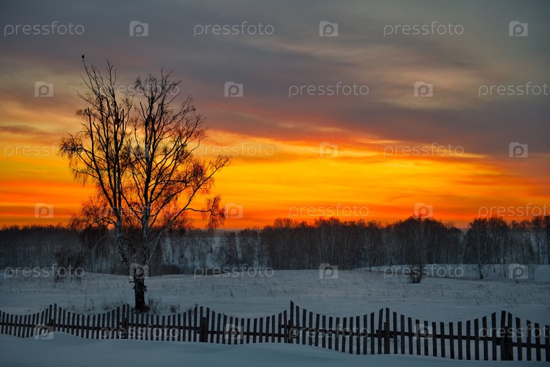 Россия, Южный Кузбасс. Разноцветный живописный рассвет морозным утром в заснеженных полях