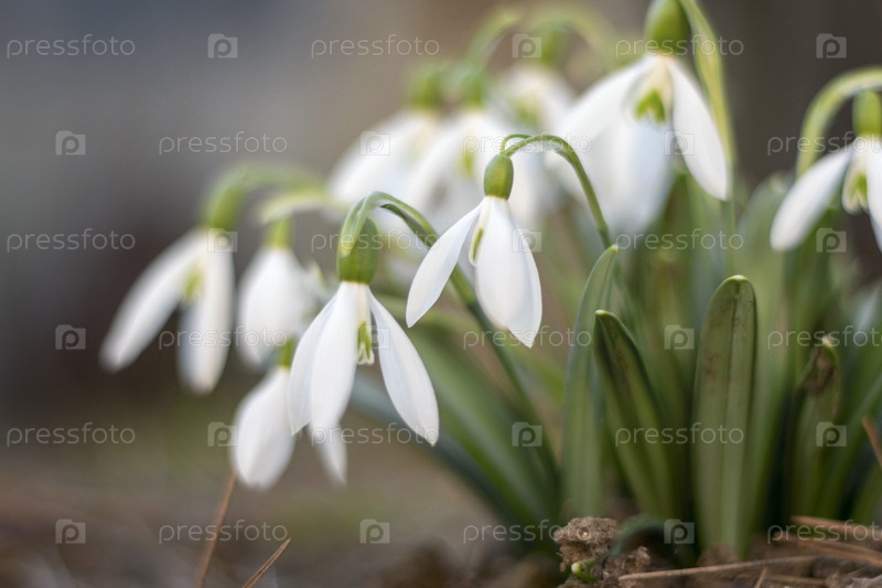 Первые весенние подснежники на поляне крупным планом, мягкий фокус