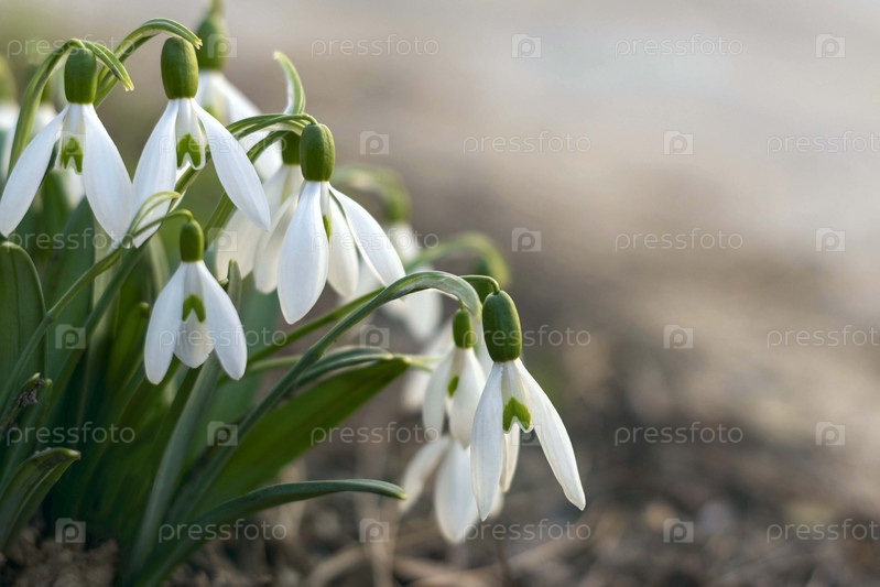 Первые весенние подснежники на поляне крупным планом, нежный белый цветок, поздравительная открытка, мягкий фокус