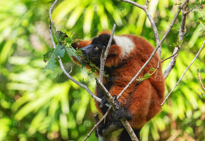 Красный лемур Вари, Varecia variegata Rubra, сидит на дереве и ест зеленые листья