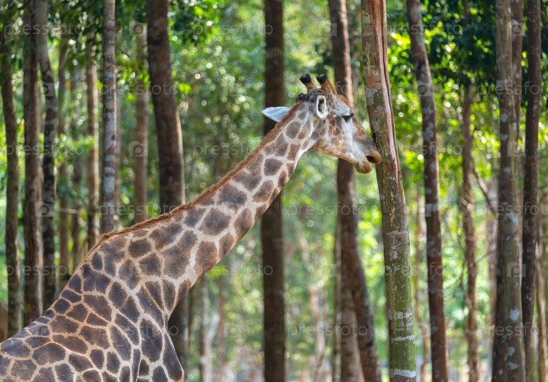 Жираф среди высоких стволов деревьев