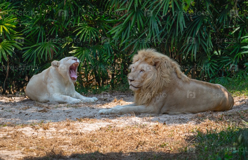Лев рядом со львицей отдыхает в тени деревьев в жаркий день
