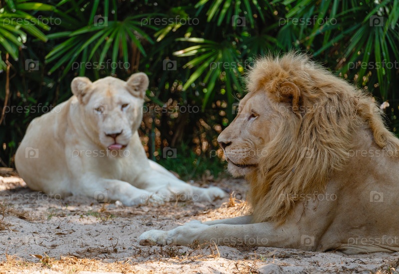 Лев рядом со львицей отдыхает в тени деревьев в жаркий день