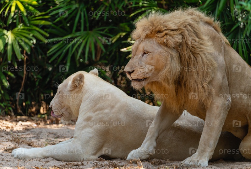 Лев рядом со львицей отдыхает в тени деревьев в жаркий день
