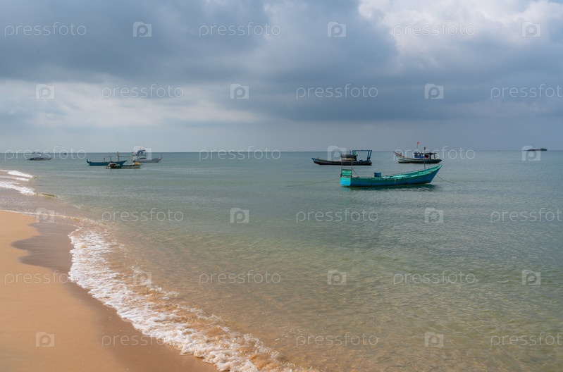 Рыбацкие лодки стоят у берега во время плохой погоды в Южном море