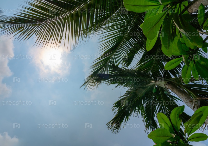 Тропический лес, пальмы и другие растения на фоне неба и яркого солнца, вид снизу