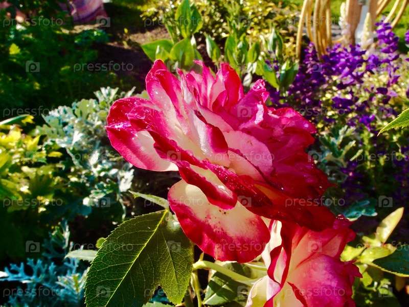 Красивая роза с лепестками, покрытыми каплями дождя, на фоне зелени сада