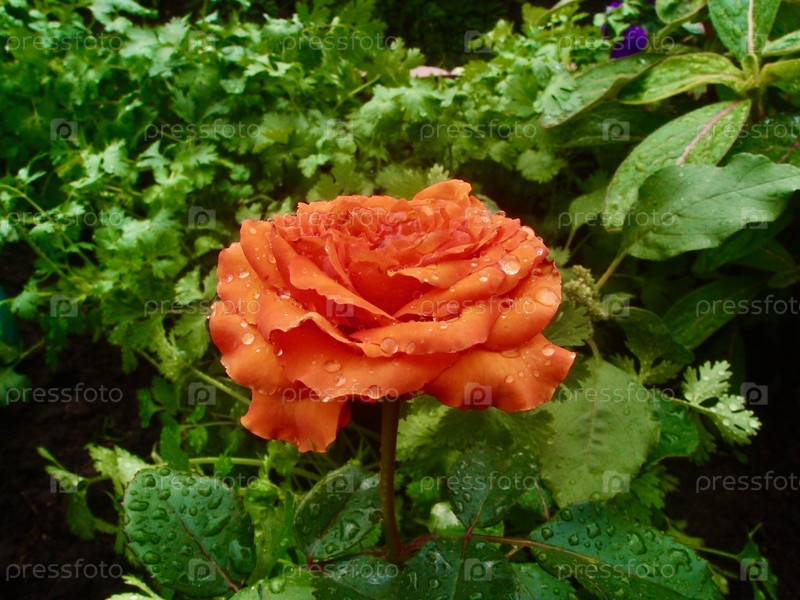 Красивая роза с лепестками, покрытыми каплями дождя, на фоне зелени сада