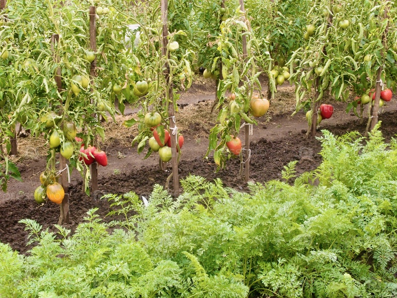 Кусты с зелеными и красными помидорами в саду