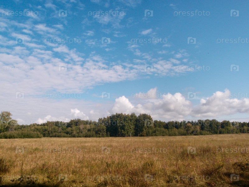 Поле и лес Омской области на фоне красивых облаков в голубом небе
