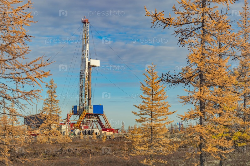 Пейзаж месторождения нефти и газа в северной лесотундре Сибири. Главный объект — буровая установка, которая вписывается в живописный осенний пейзаж таежных деревьев