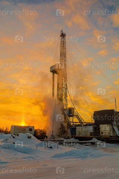 Бурение скважин зимой на нефтегазовом месторождении в Арктике. Полярный день с текстурированным красивым небом. Паровые затяжки для отопительного оборудования