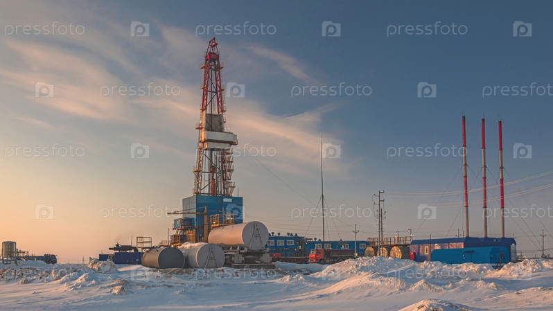 Общий вид буровой установки для бурения скважин на нефтегазовом месторождении в Арктическом регионе. Зима. День. Буровое оборудование и техническая инфраструктура