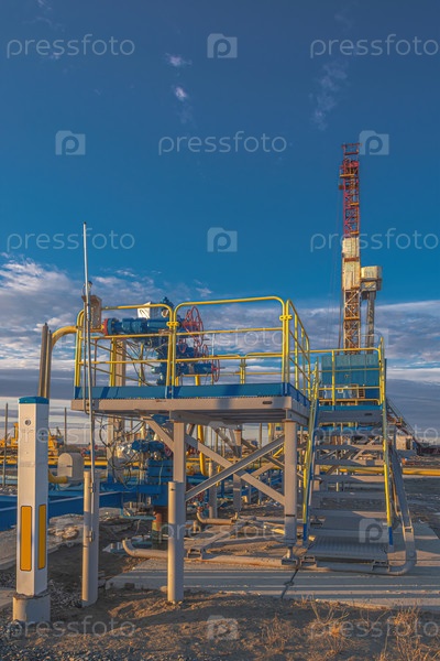 Скважины, добывающие природный газ на месторождении в Арктике. Фонтанное оборудование и технологическая обвязка группы скважин для добычи газа. На заднем плане буровая установка. Красивое небо
