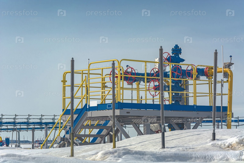 Скважины, добывающие природный газ на месторождении в Арктике. Фонтанное оборудование и технологическая обвязка группы скважин для добычи газа. Зима. День. Инфраструктура газодобывающего предприятия