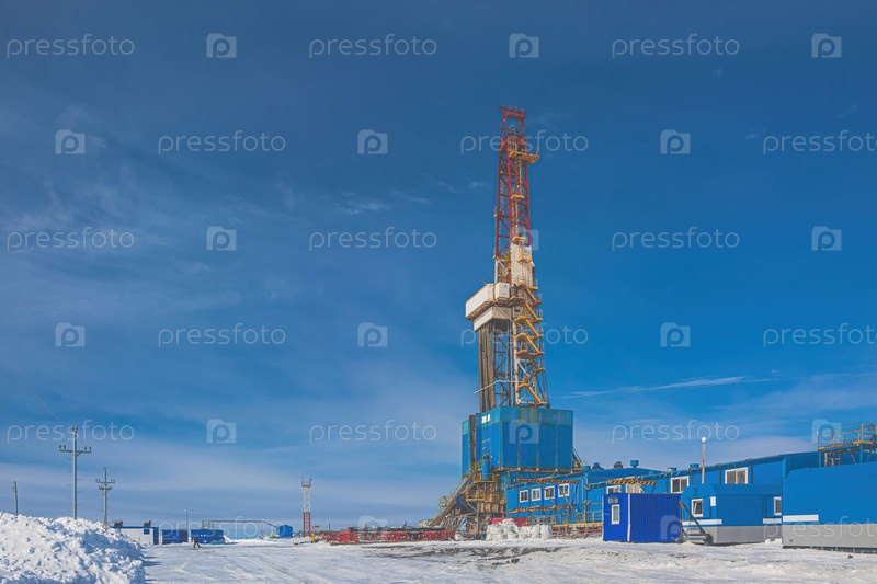 Общий вид буровой установки для бурения скважин на нефтегазовом месторождении в Арктическом регионе. Зима. День. Буровое оборудование и техническая инфраструктура