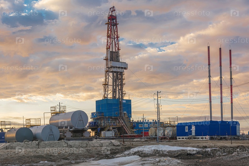 Общий вид буровой установки для бурения скважин на нефтегазовом месторождении в Арктическом регионе. Зима. День. Буровое оборудование и техническая инфраструктура