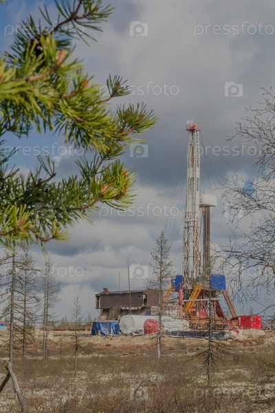 Природный ландшафт северного нефтегазового месторождения с буровой установкой для бурения глубоких скважин. Весенний хвойный лес, голубое облачное небо