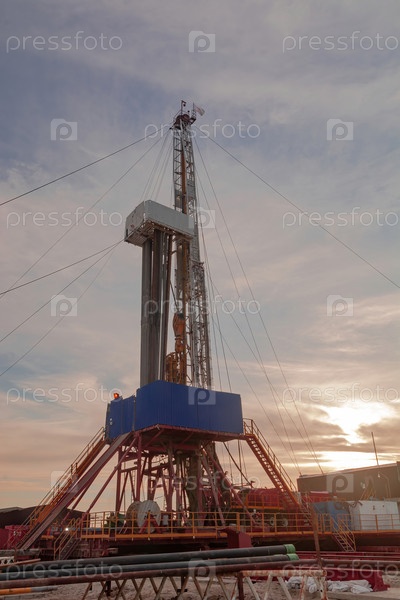 Участок в северной тундре на нефтегазовом месторождении. Буровая установка для бурения скважин. Инфраструктура и буровое оборудование для проведения буровых работ. Красивое выразительное небо
