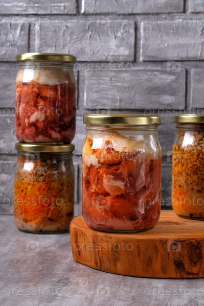 Различные консервы тушеного мяса в стеклянных банках на столе на сером фоне. Консервы из свинины и гречки, готовое блюдо
