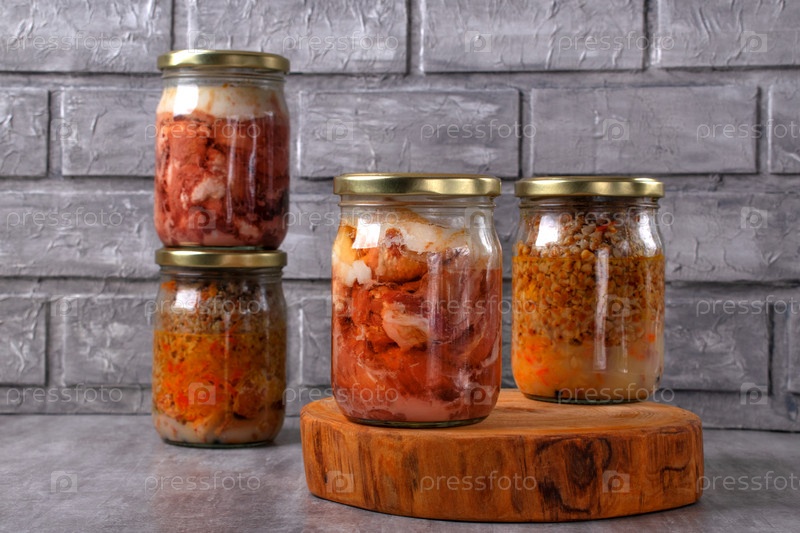 Различные консервы тушеного мяса в стеклянных банках на столе на сером фоне. Консервы из свинины и гречки, готовое блюдо