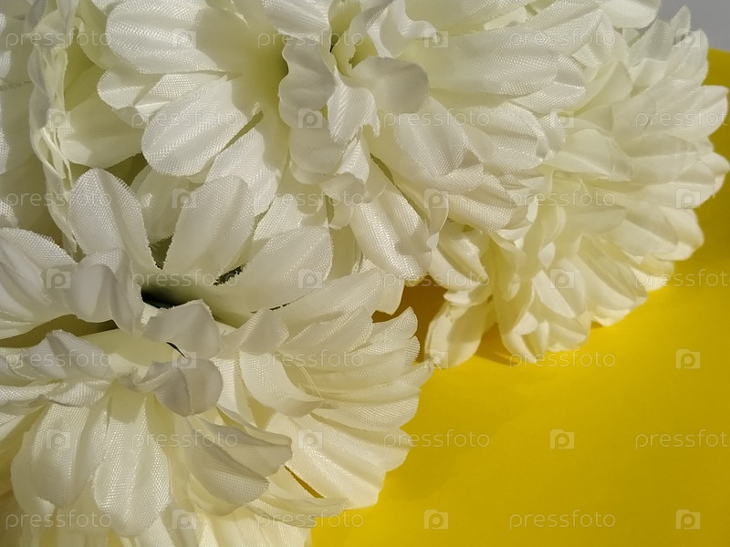 Цветы хризантемы в мягких пастельных тонах. Красивые белые цветы на желтом фоне. Открытка с Днем Святого Валентина или Днем матери